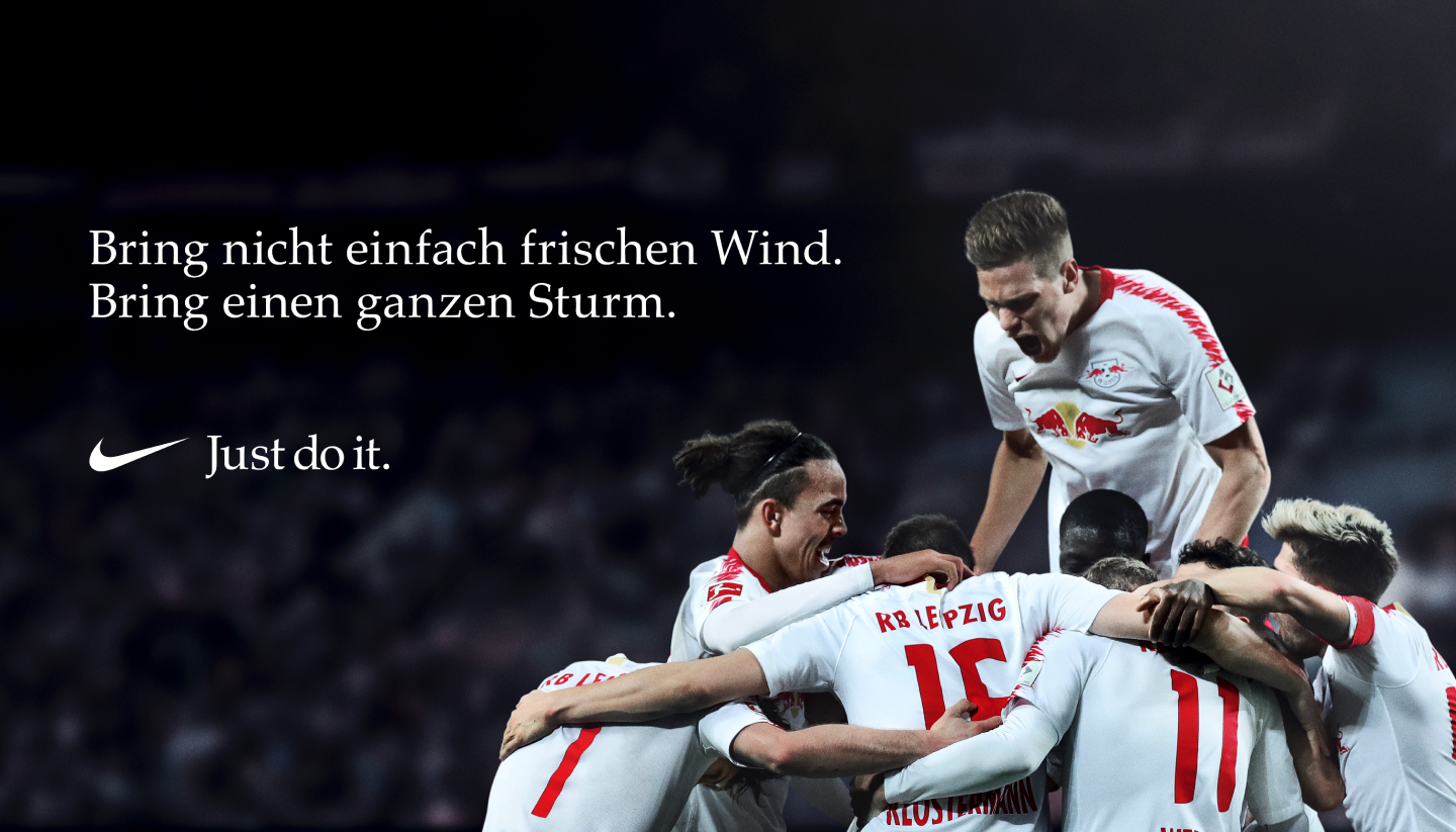 For the DFB Pokal, we wrote the battle cry for RB Leipzig's run to the final: Bring nicht einfach frischen Wind. Bring einen ganzen Sturm. Don't just bring a fresh wind. Bring an entire storm.
