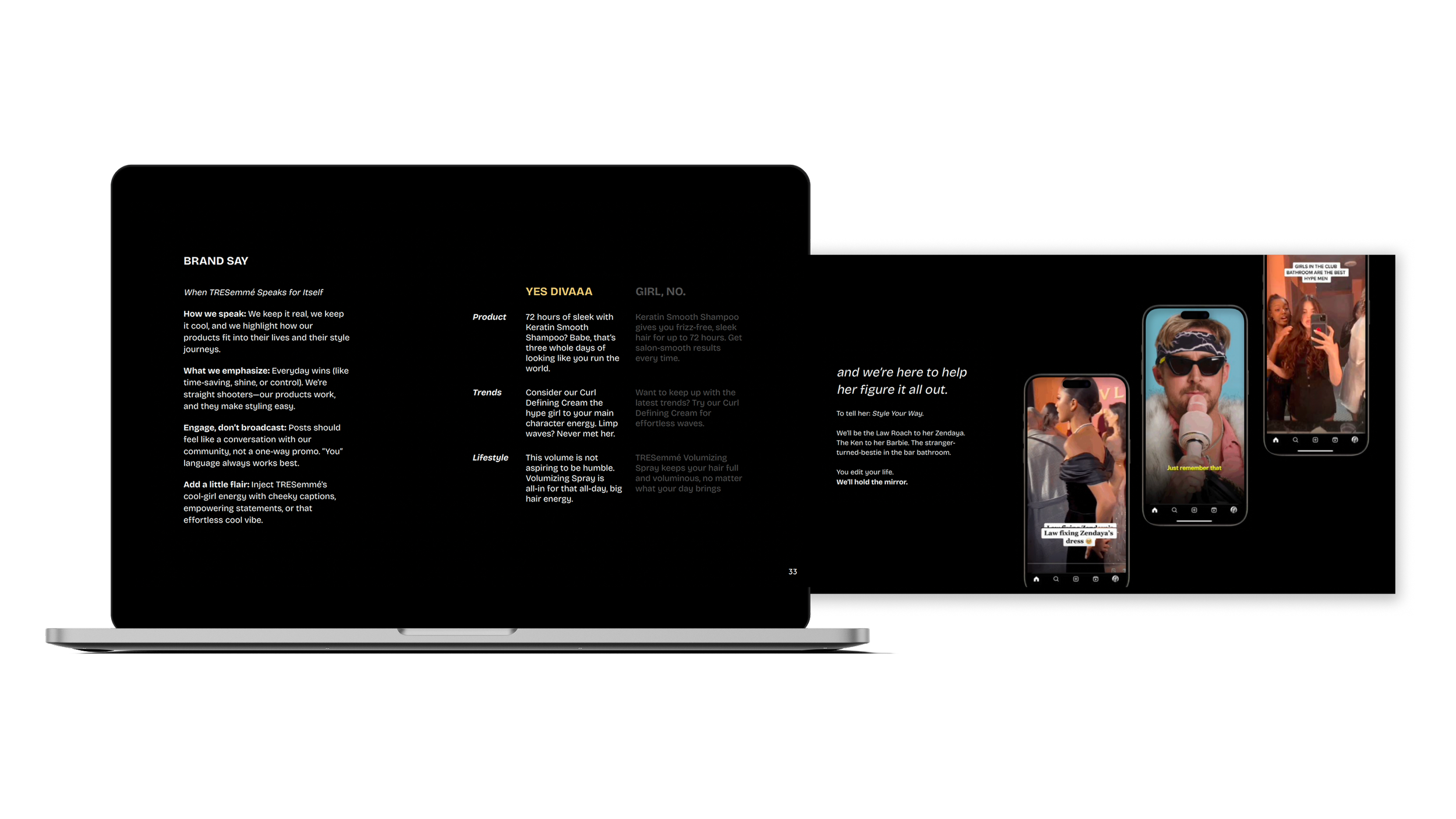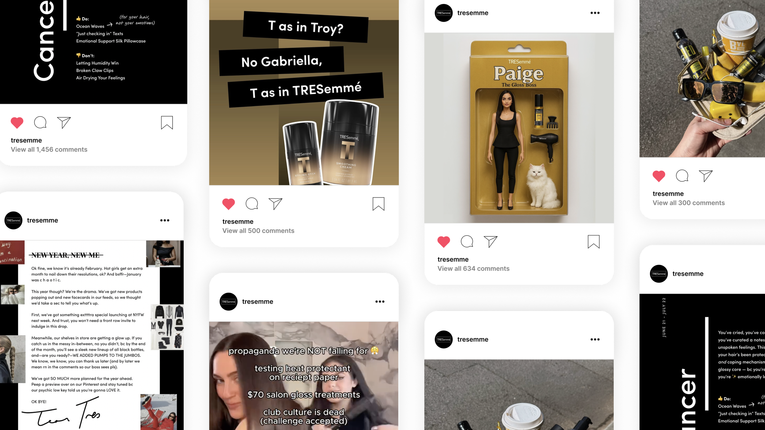 I came in to help rewrite her story. The goal: make TRESemmé feel relevant again —not by chasing trends, but by building a personality that could actually hold a conversation. Together with strategy, design, and community management, we rebuilt the brand from the inside out: a tone that was bold, clever, and just the right amount of bratty. The kind of beauty girl who can talk split ends and pop culture in the same sentence.